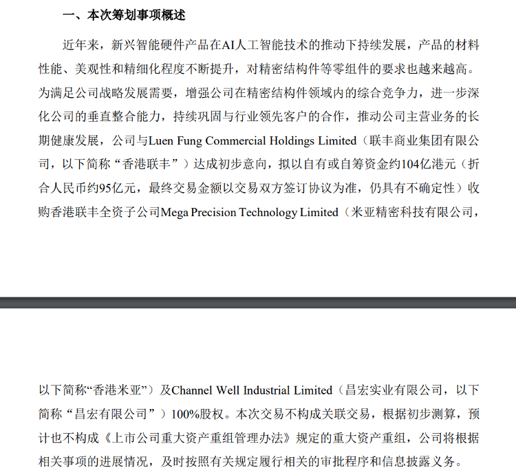 海报新闻记者周·林芬(Zhou Lingfeng)在7月22日晚上的报告中,戈尔特克(Gortek)与香港利安芬(Hong Lianfeng)达成了初步意图,目的是赢得具有精确技术的100%巨型精确技术的100%,以满足公司的战略发展需求,并在精确的结构成分领域中增加全面的竞争。工业有限公司(Changhong Industrial Co.,Ltd。)拥有约104亿香港(相当于约95亿元人民币)的专有或自动资金。近年来,在促进人工智能技术的促进下,新兴的智能硬件产品继续发展,并不断改善产品的性能,美学和精致,并且对精确结构材料和其他组件的要求越来越高。 “获得提高公司在Precision Stru领域的全面竞争力的目标他在公告中清楚地说:“延长垂直整合能力,加深垂直整合能力并继续与行业领先的客户进行整合。”他在公告中清楚地说。GoertekGroup宣布提醒人们公告有关他们采取行动的计划。两家香港公司已成为“大坝”。又一次竞争的链条又有竞争力的领先地位。金属/非金属材料,精细的表面处理和其他相关领域的中心技术与精确结构成分领域的领先客户具有长期的合作,并具有重要的收入和资产措施,并且与公司的现有精确构成公司的互补效果和协同效果。N对于2024年的这两家目标公司的n约为9.11亿美元,某些最终财务指标受审计数据的约束。我在这里。在2024年Gertek年度报告中,据报道了Goertek精确结构的当前业务。该公告表明,在2024年,属于精确结构组件业务的领域的“富本巢”,它们代表了公司收入的14%以上。 Gertek Co.,Ltd.该公告已改变了几项收款资金的目的,并永久补充了营运资金。 Goertk Co.,Ltd.上述公司发布该公司后,一些分析师认为,这是该公司的另一种战略设计。记者以前是Goertek Co.,Ltd。我们发现,我们正在投资于AR/VR等前卫领域,以及相关光学模块的开发和开发项目,就像我们一样LL作为真正的真实无线智能耳机的双耳项目,并且正在积极组成并显示对未来智能硬件趋势的投资。十亿是对公司主要业务中的另一重要战略措施。在宣布这一消息之前,Gortek Group正式向香港证券交易所的IPO启动了Spinar Goertek Microelectronics的申请。一方面,将Goermicro资本化,另一方面,这是一个收购计划,也是各种标志。 Goertek似乎正在尝试整合相关行业的供应链,并成为行业领导者的系统集成商。 Gortek股票的价格(来源:百度股票市场)并不遵循该示例,而是遵循自己的道路。当涉及Gortek的“行业领先客户”时,投资者将不可避免地想到苹果。但是,由于苹果的请求因素,Goertek股票的价格最多下降了56元大约16元。但是,截至7月24日,Gortek的股价为23.72元人民币。自今年年初以来,股票的价格一直在波动,但显示出上升趋势。不仅如此,而且是著名的天芬国际苹果工业连锁店敏奇(Ming-Chi Kuo)的社交网络的出版物已成为两个新的苹果产品,Smart Home和AirPods网络摄像头的NPI提供商。恢复正常的“学习错误”,您可能已经了解到,单方面的供应商或过去的模块无法提供暂时的稳定性,并且无法加强双方之间的合作。也许据此,实施了Gertek的收购令。它是苹果中心供应商之一,因此更可靠地定位了,因为它很可能会成为“子系统集成提供商”作为Luxshare精确度。此外,Goertek在自己的整个努力中也做出了新的努力,在寻找Revenuei时稳定了谎言为了新的收入增长。 2024年,Gortek OEM硬件业务开始填补苹果订单的空白,这一年的总收入恢复到1009.54亿元人民币,净收益年复一年144.93%。硬件OEM为Gortek在将来成为Apple系统级供应商的基础奠定了基础,还提供了将其他公司整合到“果链”中的机会。可以说,戈尔特(Gortek)踏上了自己的道路,戈特克(Goertek)正在遵循其他“水果链”公司的道路。制度观点:对长期发展的乐观情绪。 Goertek成立于2001年,于2008年出现在深圳深圳证券交易所。该公司专注于电器和汽车电子等行业。它的主要产品包括精确组件,例如声学,光学,微电子,结构组件,虚拟现实的虚拟现实,混合现实MR,增强现实,智能无线headp磨练,智能无线耳机,用于家庭的智能电子游戏的游戏机和配件,智能家居家具等等。研发投资项目在Gortek的2024年年度报告中披露。今年,AI是唯一引起了广泛市场关注的眼镜的产品,而Gortek已经计划了很长时间。 2024年的年度报告表明,与该公司智能眼镜有关的当前智能眼镜相关项目包括AI智能眼镜的光学设备以及AR Module AR Pro Project Project Project of Optical模块的R&D项目。从市场规模的角度来看,根据Counterpoint研究统计数据,智能眼镜的全球货物在2024年中间增加了210%,总数首次大于200万NT。根据Weishen的预测,到2025年,AI智能斯特尔销售市场将实现质量增长。作为智能眼镜链中的关键参与者毫无疑问,Goertk的技术力量Ustry在未来的市场竞争中建立了基础。关于收购计划,创始人证券表示,收购将补充Goertek在精密金属的结构组件(例如纳米级的轻质钛合金和表面处理)领域中的技术故障,并形成与现有产品相互竞争的综合层的综合功能。眼镜和便携式设备。 Caixin Securities在之前的研究报告中说,该行业需求的回收,化合物的业务是贵公司的准确性,智能声学机器的一般业务,虚拟虚拟现实现实,先生的混合现实,智能笔记本电脑和其他由智能硬件业务细分市场中的生产线的混合现实,没有问题。 AI技术和智能硬件产品的集成具有Accelera在公司的精确组件业务中,原声传感器和其他产品的TED性能更新,从而提高了产品的价值和盈利能力。 Everbright证券在他的最新研